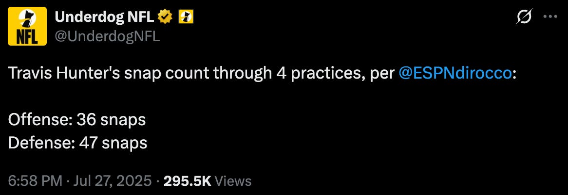 What you’ll see on X now is people taking these snap counts and claiming “Looks like Hunter is going to play 60% defense and 40% offense”, or something along those lines. There a few flaws here. First and foremost, extrapolating these snaps into a potential in-game split is fundamentally wrong. In camp, Hunter’s offense and defense are quite literally facing each other, and Hunter obviously cannot be in two places at the same exact time. This means that Hunter can only see 100% of the total snaps from camp, and they therefore have to be divvied up between offense and defense.